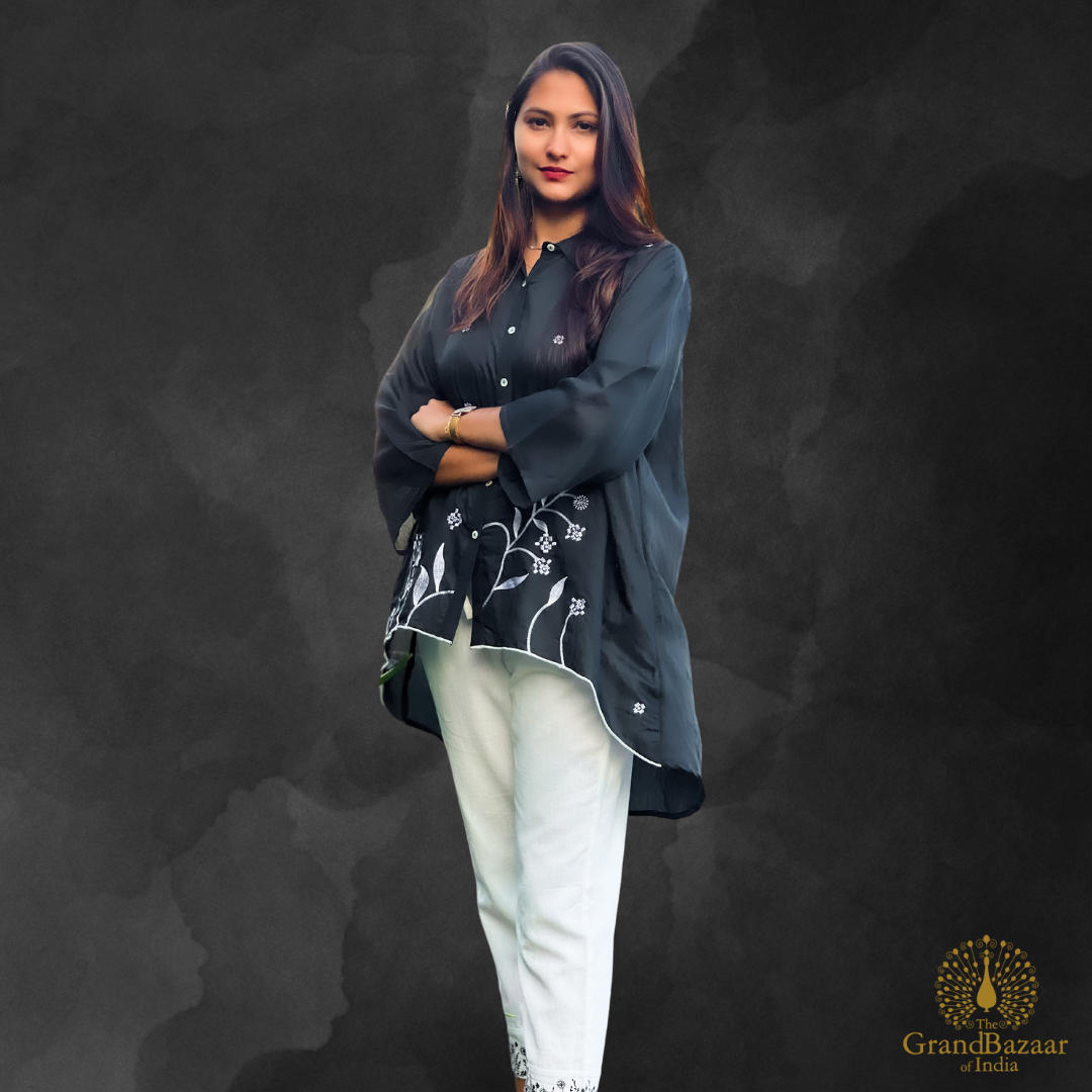 This chic black kurti is adorned with delicate white floral embroidery, offering a timeless blend of elegance and style. Paired with breathable white pants featuring complementary floral prints, this pure cotton ensemble is ideal for casual outings or semi-formal gatherings. Combining comfort with sophistication, it’s a versatile addition to your wardrobe.